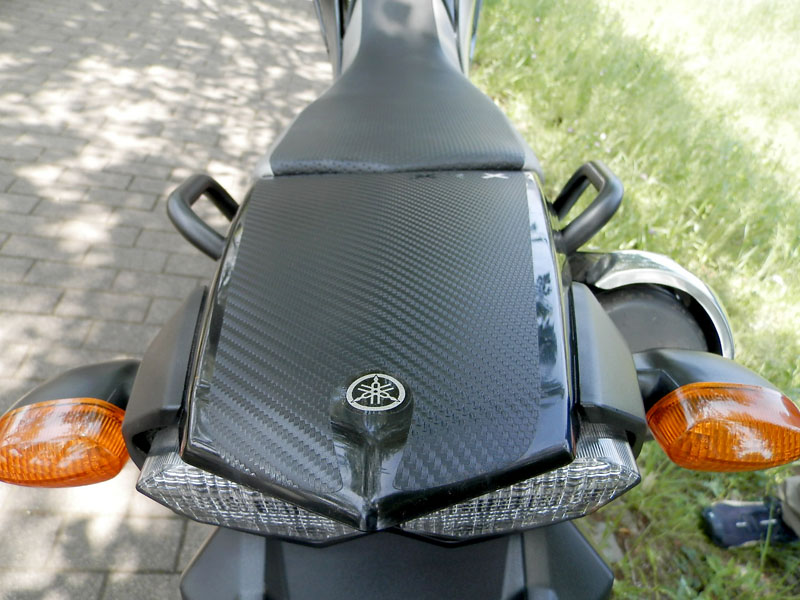 黒車に黒カーボン調のデカールは艶の有無によるトーンの違いが効いてカッコいいです。傷んだリアフェンダー天面へのリフレッシュに是非使って頂きたいです。