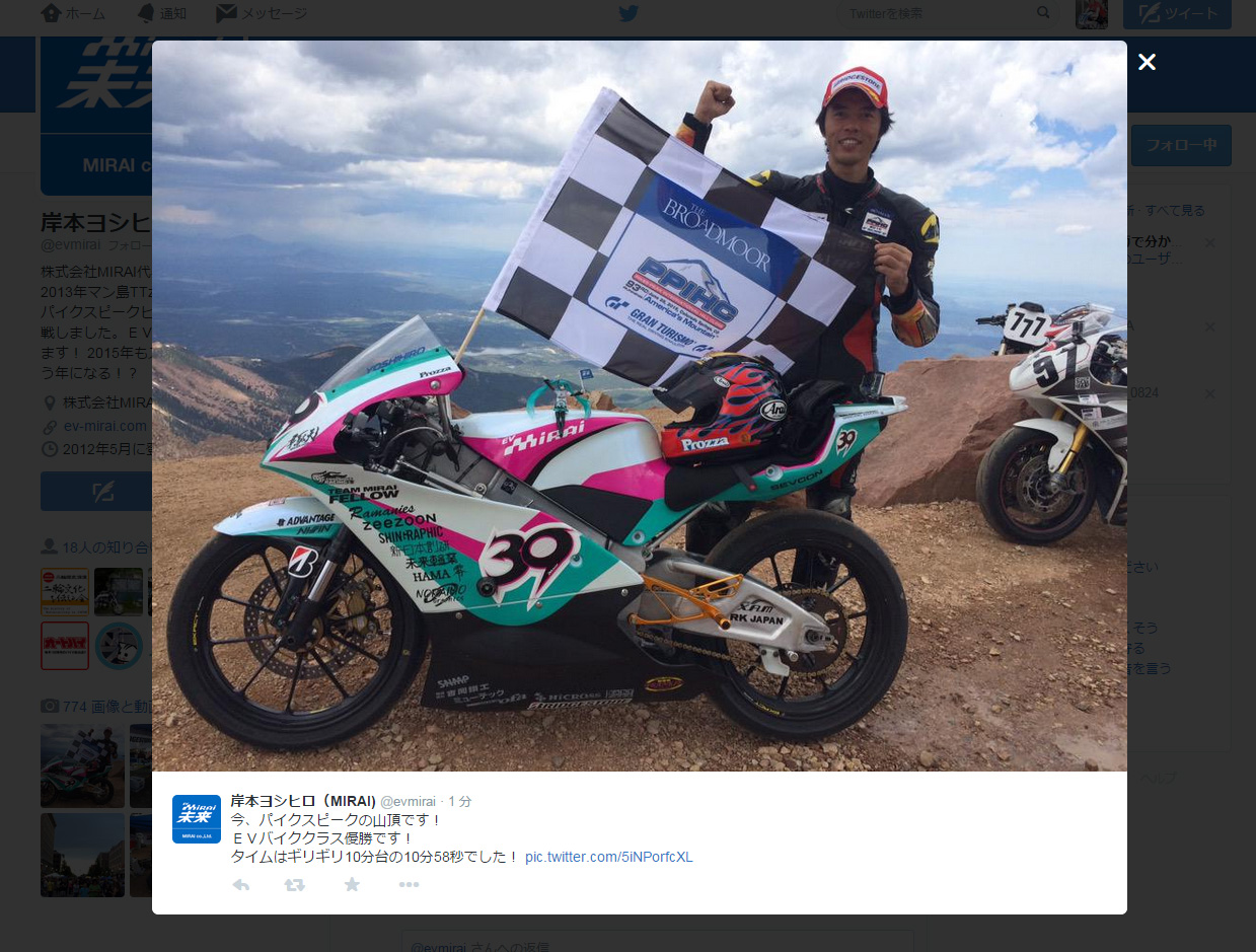 たった今のツイートですが、パイクスピーク2015のEVバイククラス優勝です。
