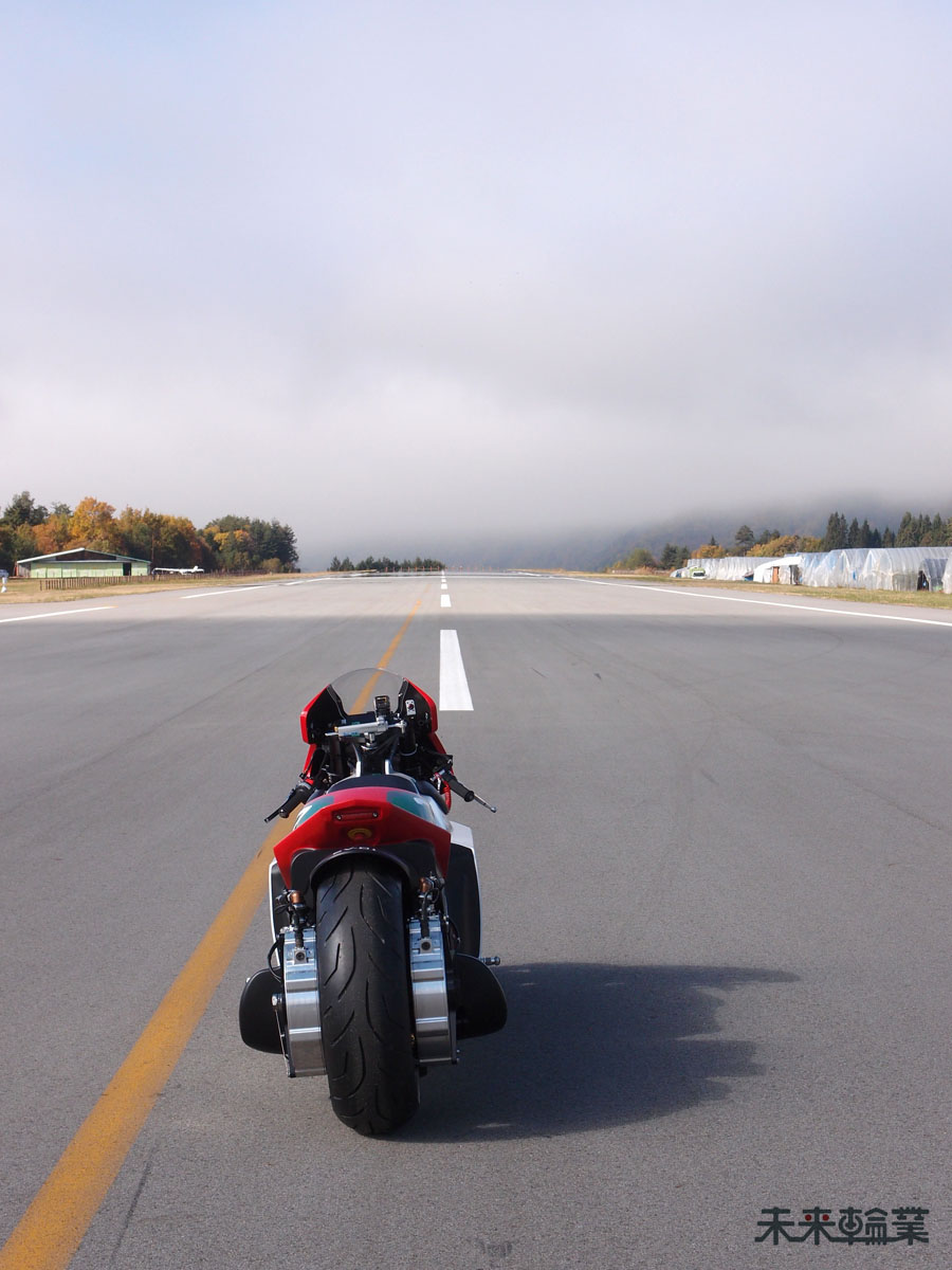 今回は動画撮影が目的なのでコースも800mほどしかなく最高速のテストは行いませんが、それでも緊張感が漂います。中止になったボンネビル現地では全く実走ができなかったので両方のモーターが揃ったフルパワー状態で走るのは初めてだったという事もあります。