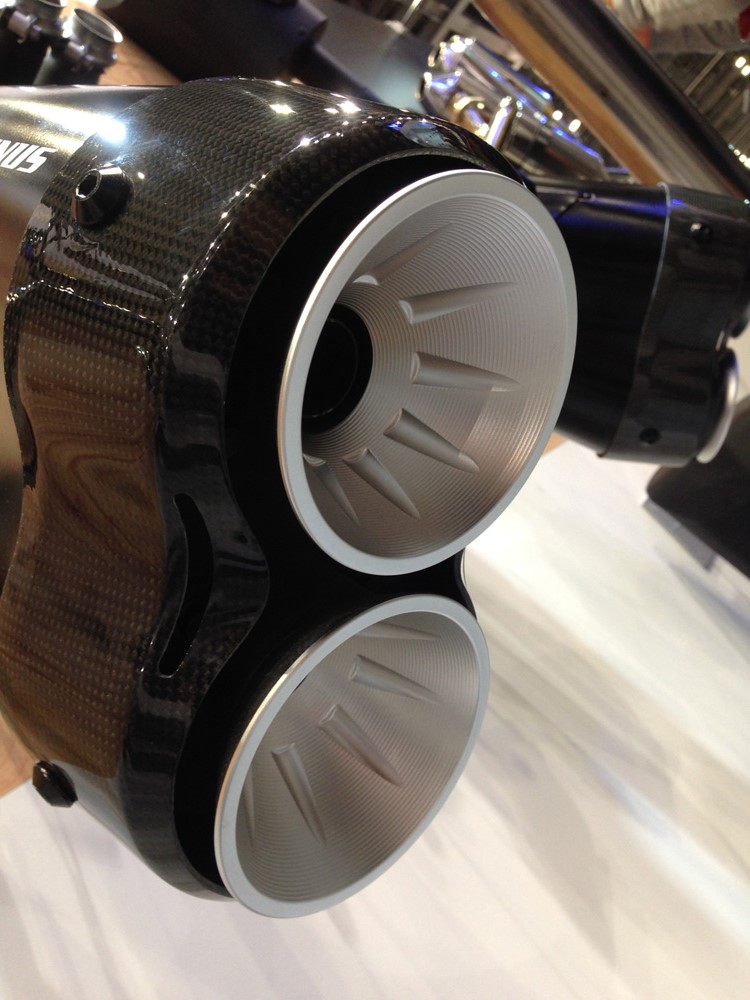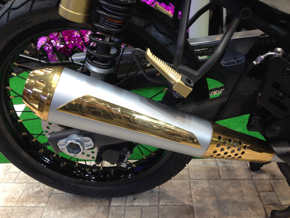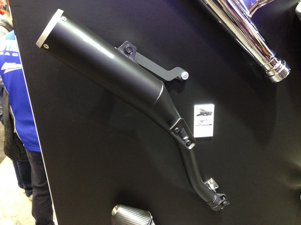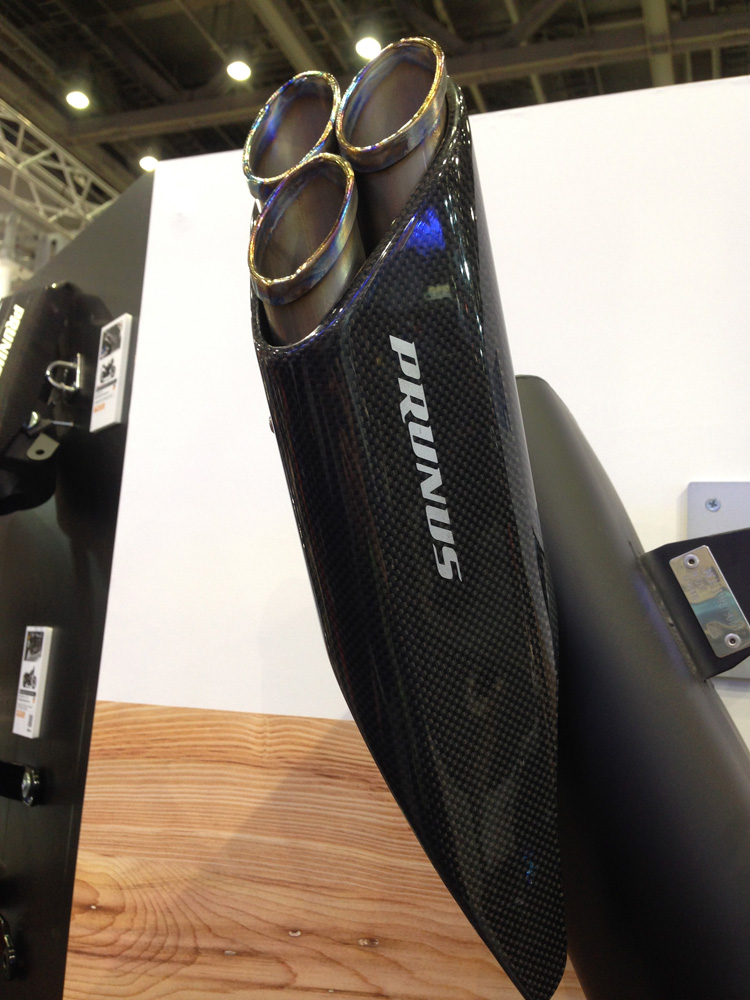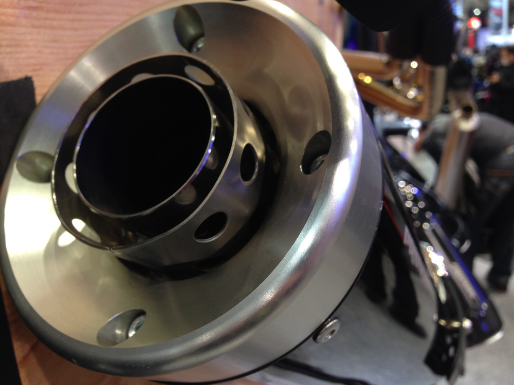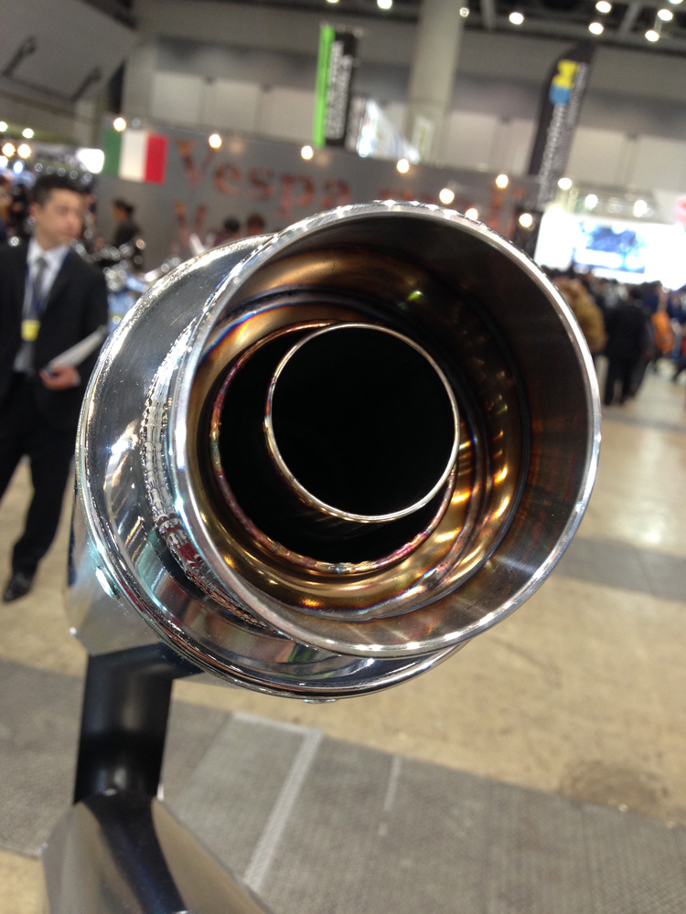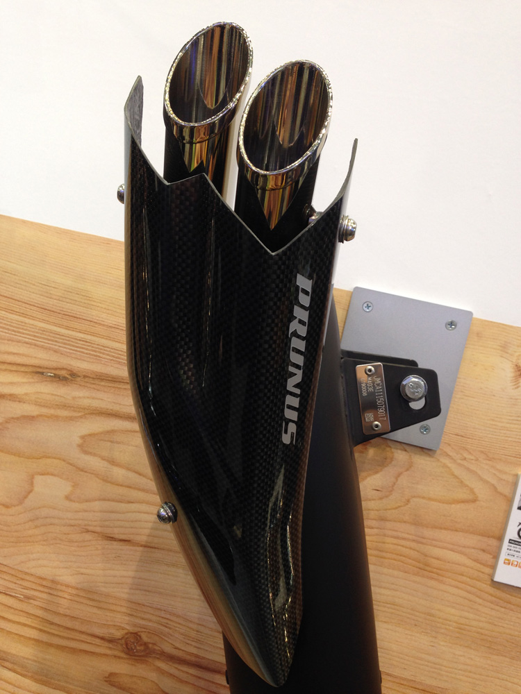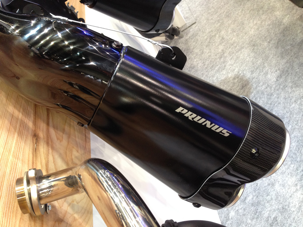 隣接したワイズギアのブースでは純正オプションともいえるサクラ工業のマフラーが