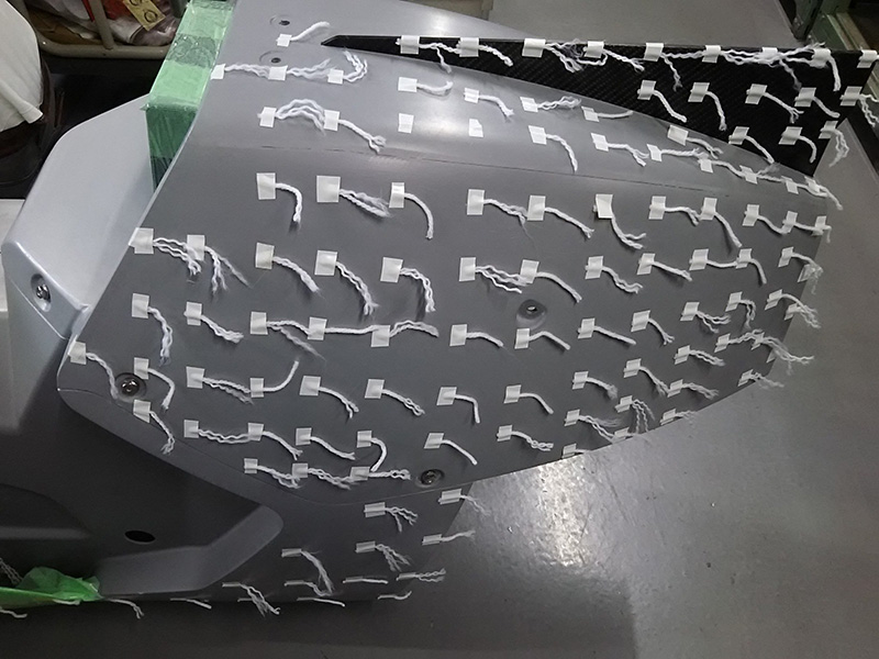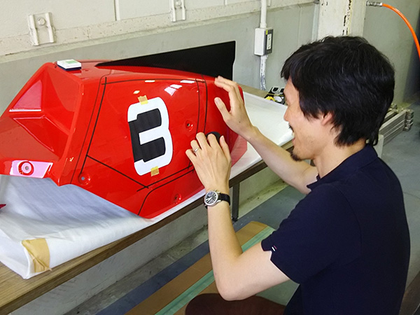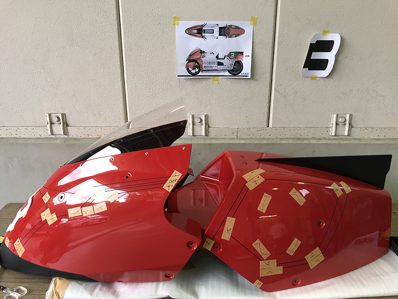 風洞試験の結果を反映してzeezoon青島さんにアッパーカウルの修正をしてもらった事もあり時間に余裕が無かったので、自分もゼッケンベースの塗り分けライン指示を現地で行いました。
