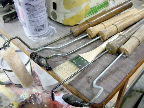最初に目の細かいマットを貼っていき、その上から通常の荒さのガラスマットを貼りこんでいきました。何枚も積層するのでだんだんとボリュームも膨らんでいき、まるでミイラのよう。。