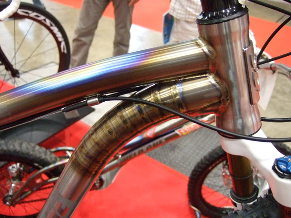ダウンチューブのカーブ部分を通常の曲げ加工ではなく高性能エンジンの排気管よろしく輪切りにした材料を溶接でつなぎ合わせて製作しています。