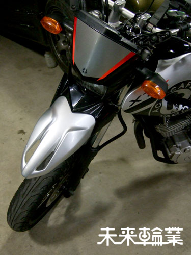 マスターのセローは車高ダウンしてありますが、停止状態でサスをストロークさせたぐらいではフェンダーとの接触はありませんでした。ただし、跳んだり跳ねたりした場合にはその限りではないそうで、マスター曰くクリアランスを潤沢に取ったノーマルフェンダーでも接触する場合があるそうなので、セロー250にこのフェンダーを装着した状態で激しいオフ走行は避けた方がよさそうです。