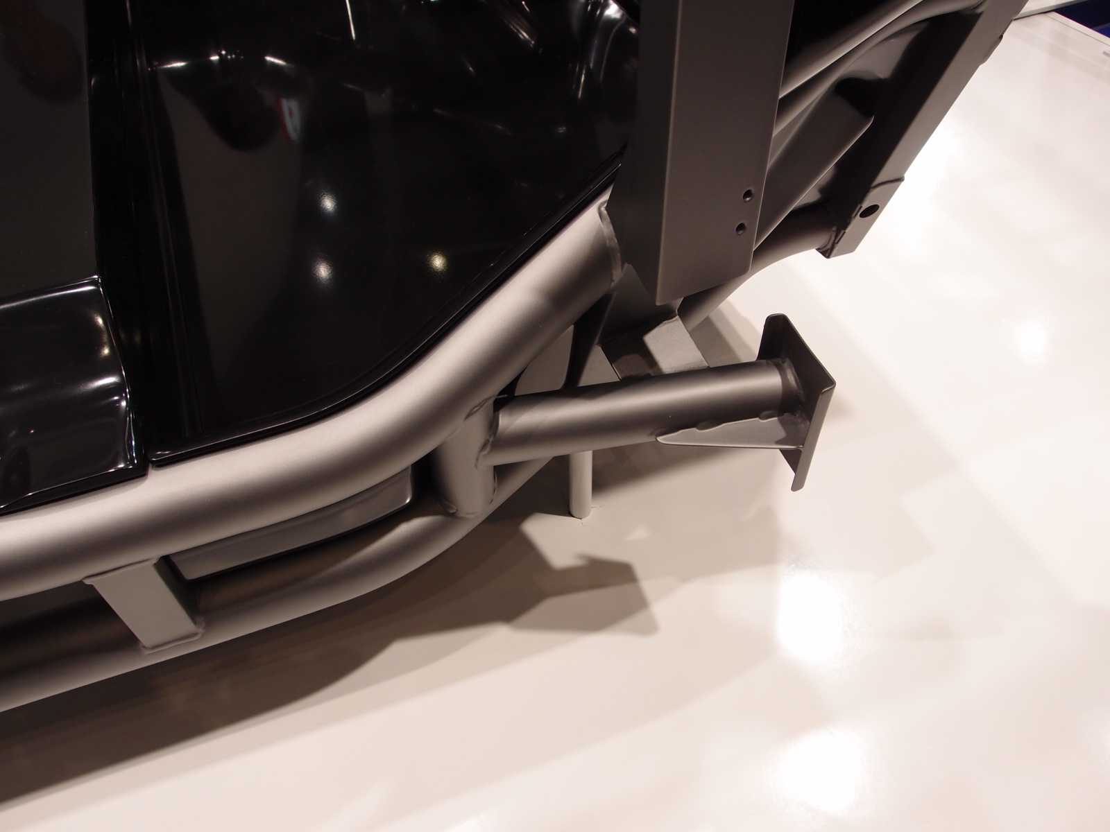 大径のパイプを3次元で曲げて造られたロア構造体、一本の部材を曲げてAピラーからルーフエンドまで通したアッパー部、それら金属の隙間をカバーするFRPパネル。