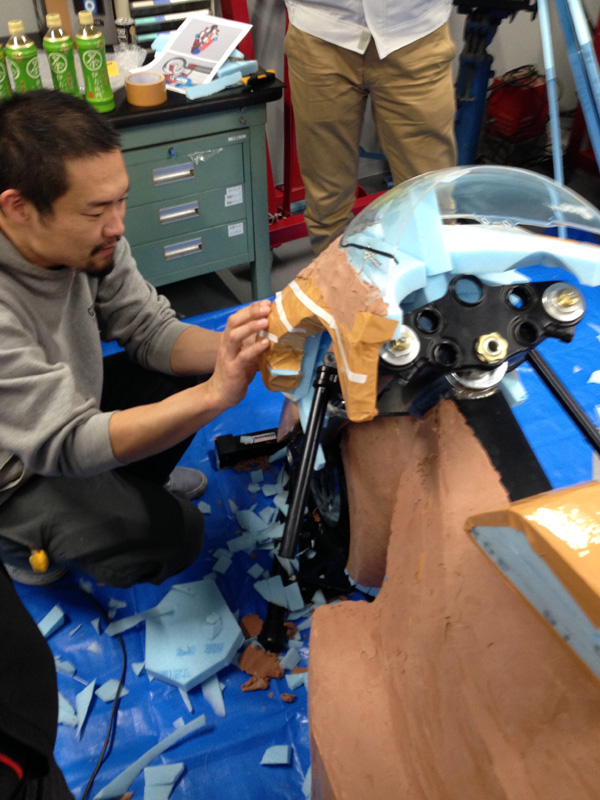 モデリング作業はFULL GAINの古川氏がメインでライダーのマルマスモーターサイクルラウンジ水谷さんも加わりものすごい速さで進んでいます。