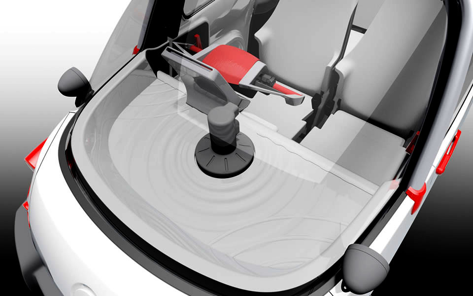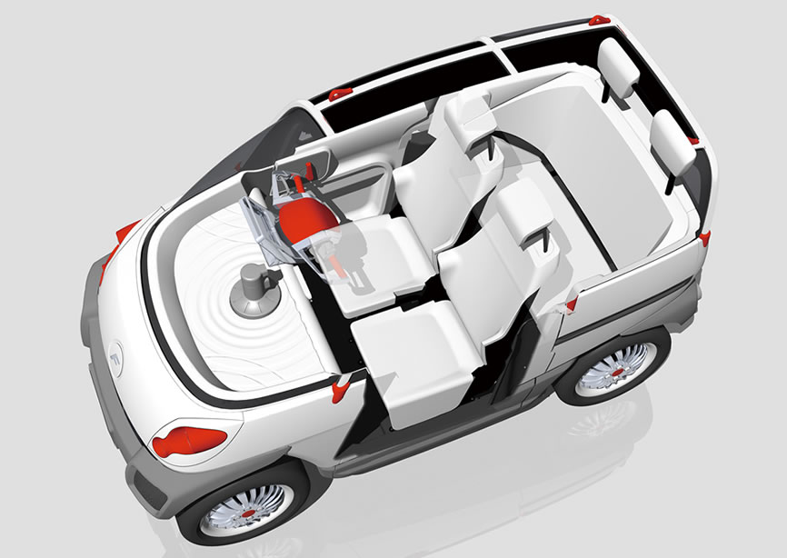 超小型モビリティのサイズに大人4人を乗車可能にした新世代の小型電気自動車です。対水害機能を持っており、緊急時には24時間水に浮かぶことができます。